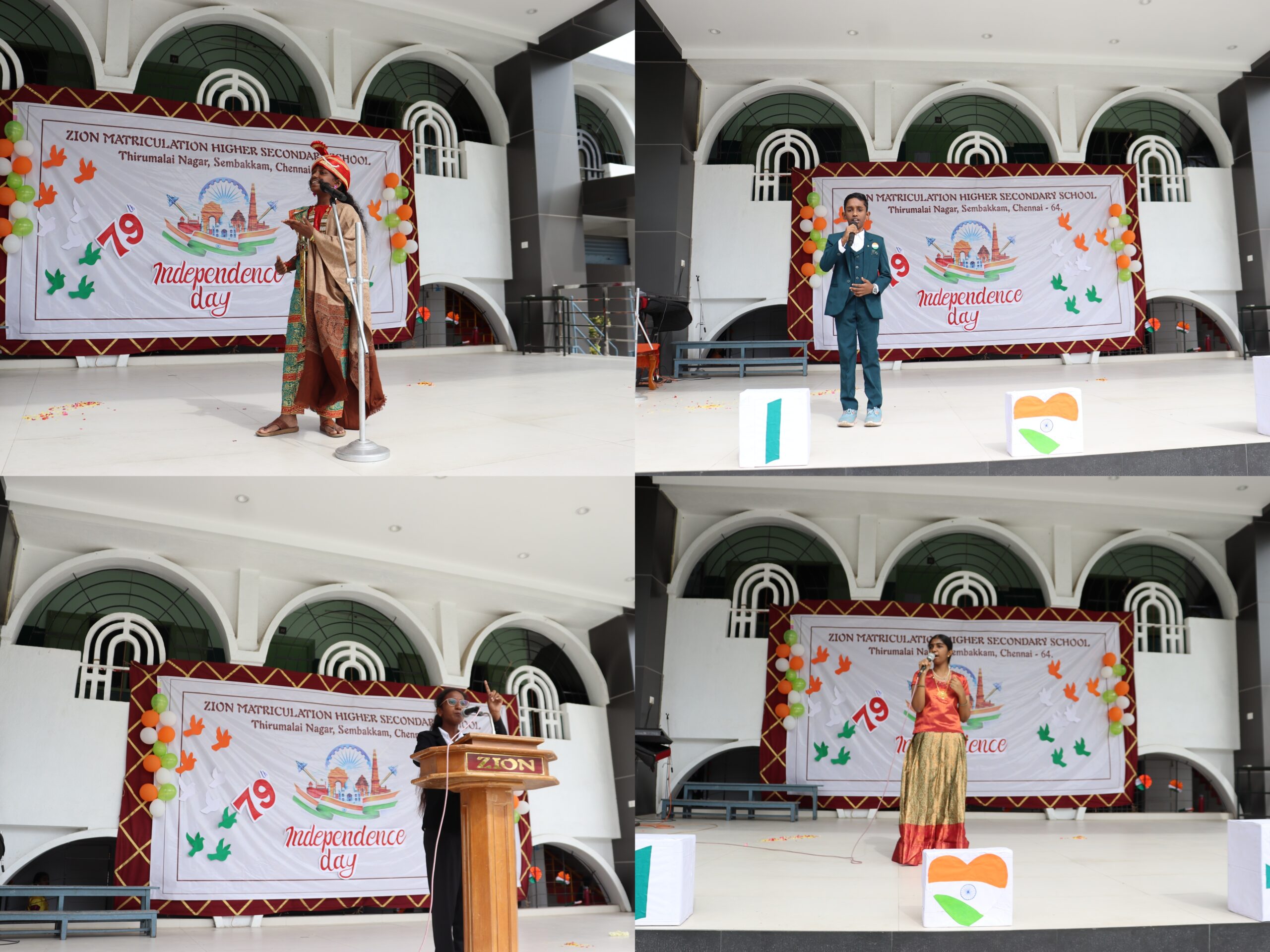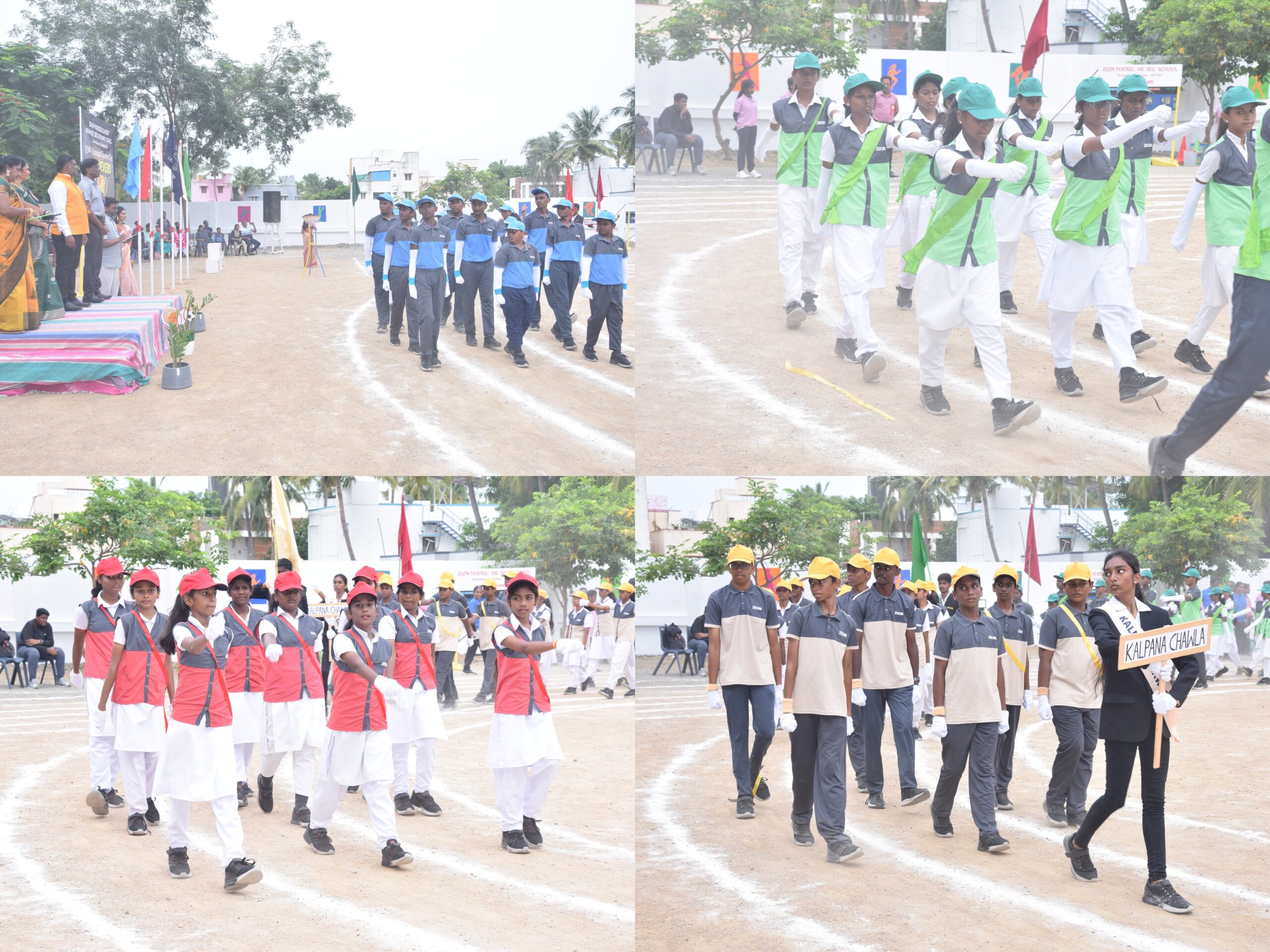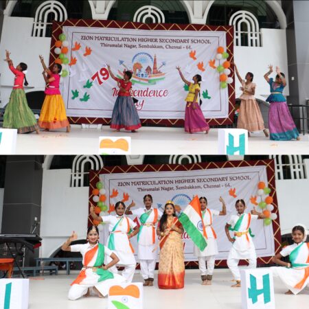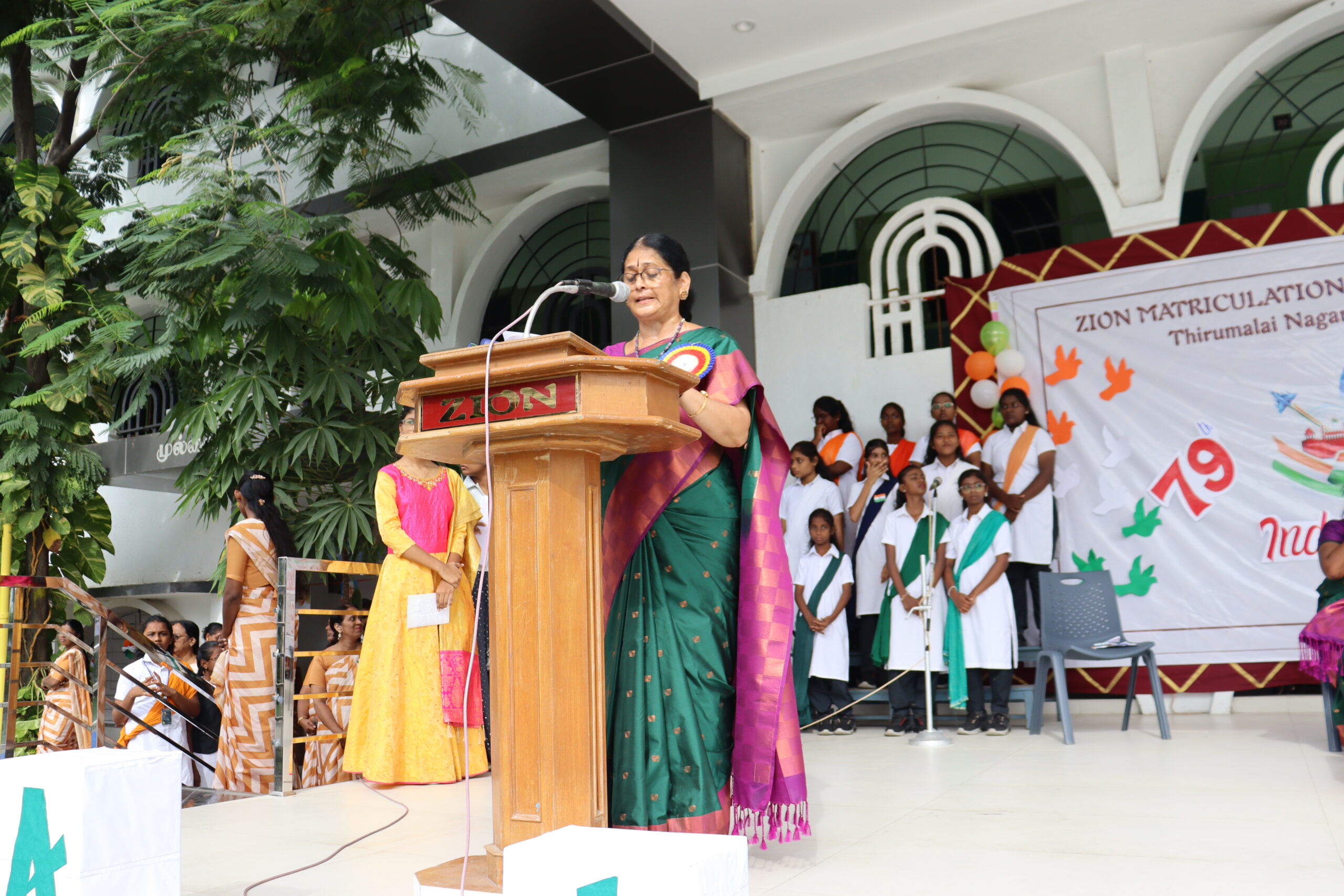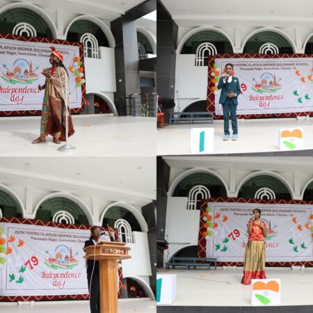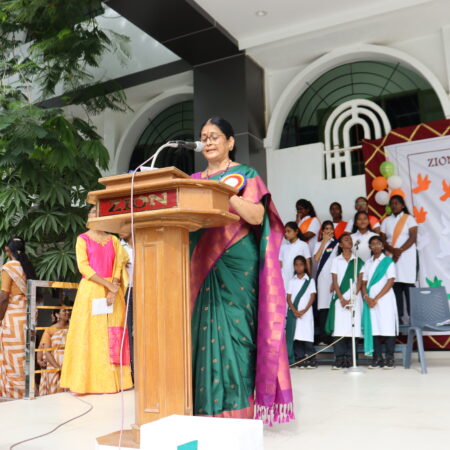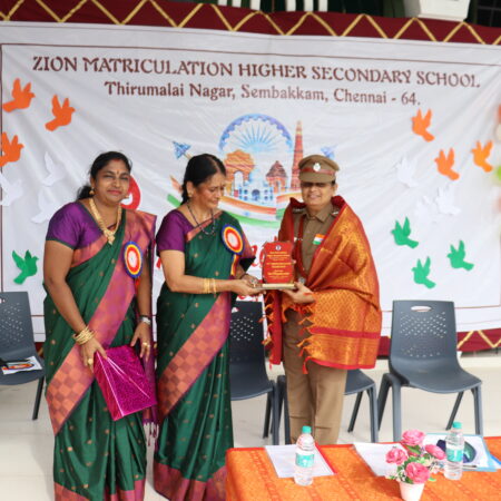 The 75th Republic Day was celebrated in Zion Matriculation Higher Secondary School, Sembakkam with zest and inculcate a sense of patriotism in students and to spread awareness about our freedom struggle, the constitution, and its values. The National Flag was unfurled, and was given the due reverence from students, teachers and parents alike. The National Anthem was played followed by Tamil Thai Vazhthu. The march-past contingents belonging to the four houses of our school along with J.R.C and Bharat Scouts and Guides clubs were led by our School Pupil Leader.