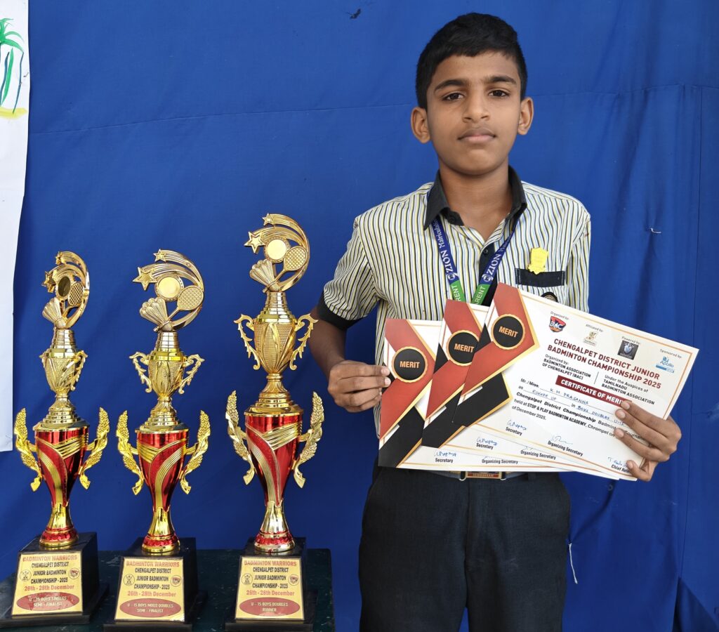 of Class VII excelled at the Chengalpattu District Junior Badminton Championship 2025, organized by the Badminton Association of Chengalpattu (BAC) and held under the auspices of and affiliated with the Tamil Nadu Badminton Association (TNBA). Prasanna delivered impressive performances across multiple events in the Under-15 category, reaching the semi-finals with strong and consistent play in both the Mixed Doubles and Boys Singles categories, while also securing the Runner-Up position in the Boys Doubles event.