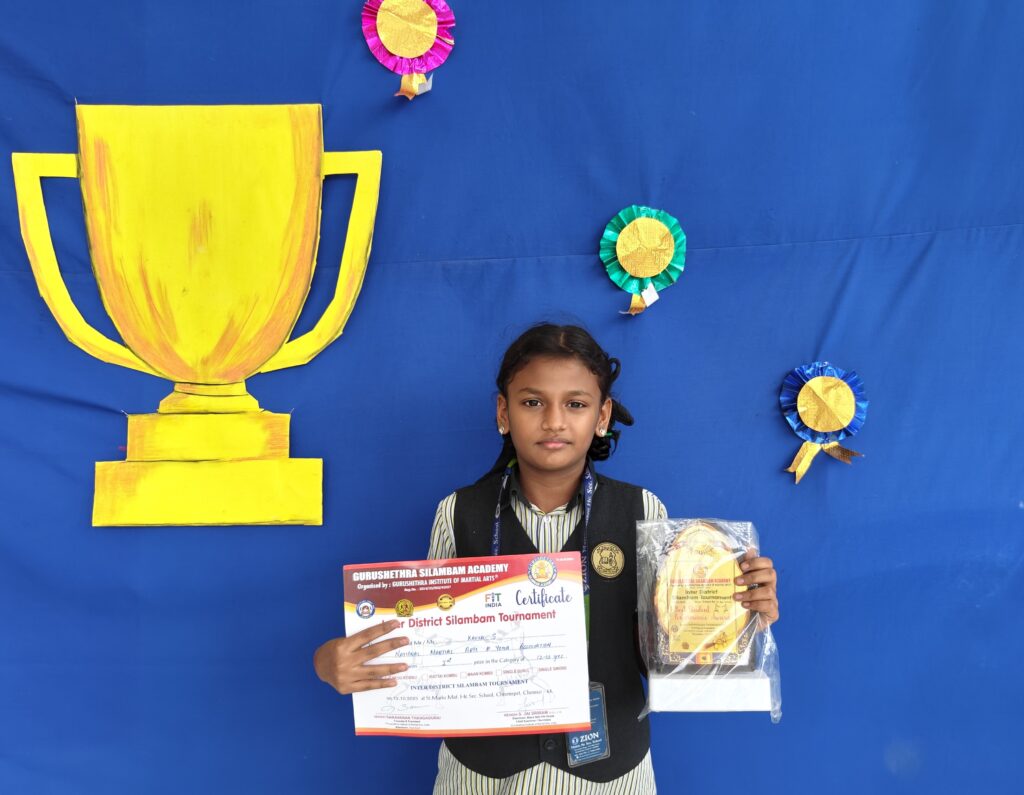 won 1st Prize at the Nedu Kombu event at the Inter District Silambam Tournament in the 12-13 years age category.organized by Gurushethra Silambambam Academy (under the National Martial Arts & Yoga Association.