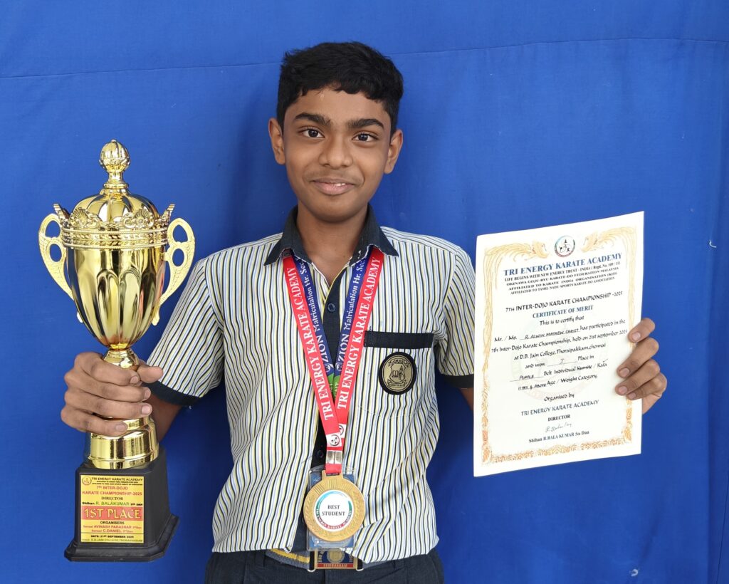 secured the 1st Place in the Purple Belt Individual Kumite/Kata category for the 11 years and above age/weight category at the 7th Inter-Dojo Karate Championship 2025, organized by Tri Energy Karate Academy under the Life Begins with New Energy Trust – India.